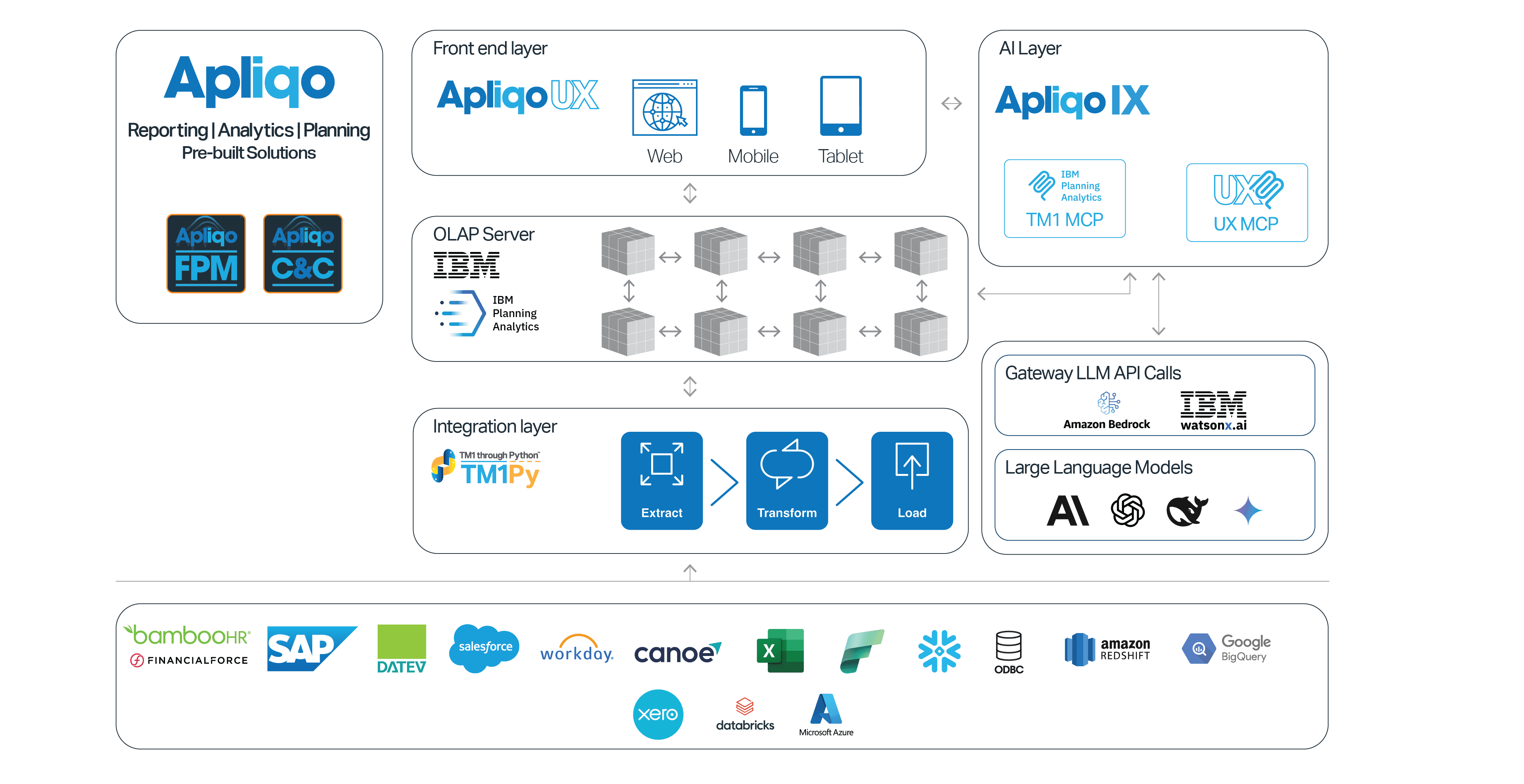 Apliqo’s architecture is designed with modularity at its core, ensuring maximum adaptability to each client’s unique business needs. At the heart of the platform is the Apliqo core engine, powered by IBM Planning Analytics - a high-performance, multi-dimensional database built for enterprise-scale financial and operational modeling.